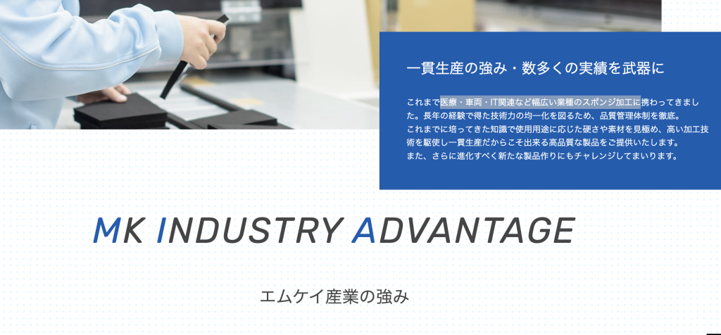 「エムケイ産業」は、医療・車両・IT関連など幅広い業種のスポンジ加工などを行う会社とのこと(→公式サイト)。
