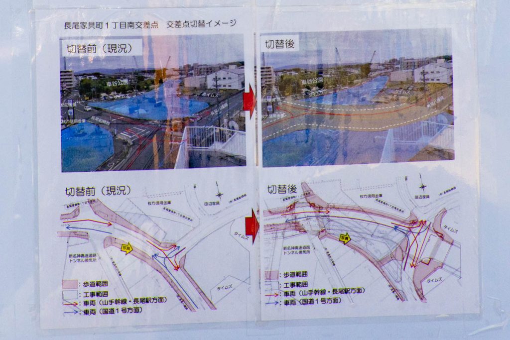 交差点「長尾家具町1丁目南」あたりが車線切替されています。