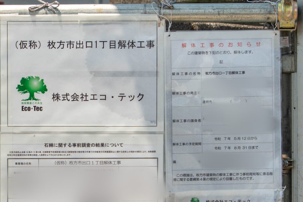 上記の現地にあった貼紙に解体工事のお知らせがありました。工事期間は2025年8月31日までとなっていました。