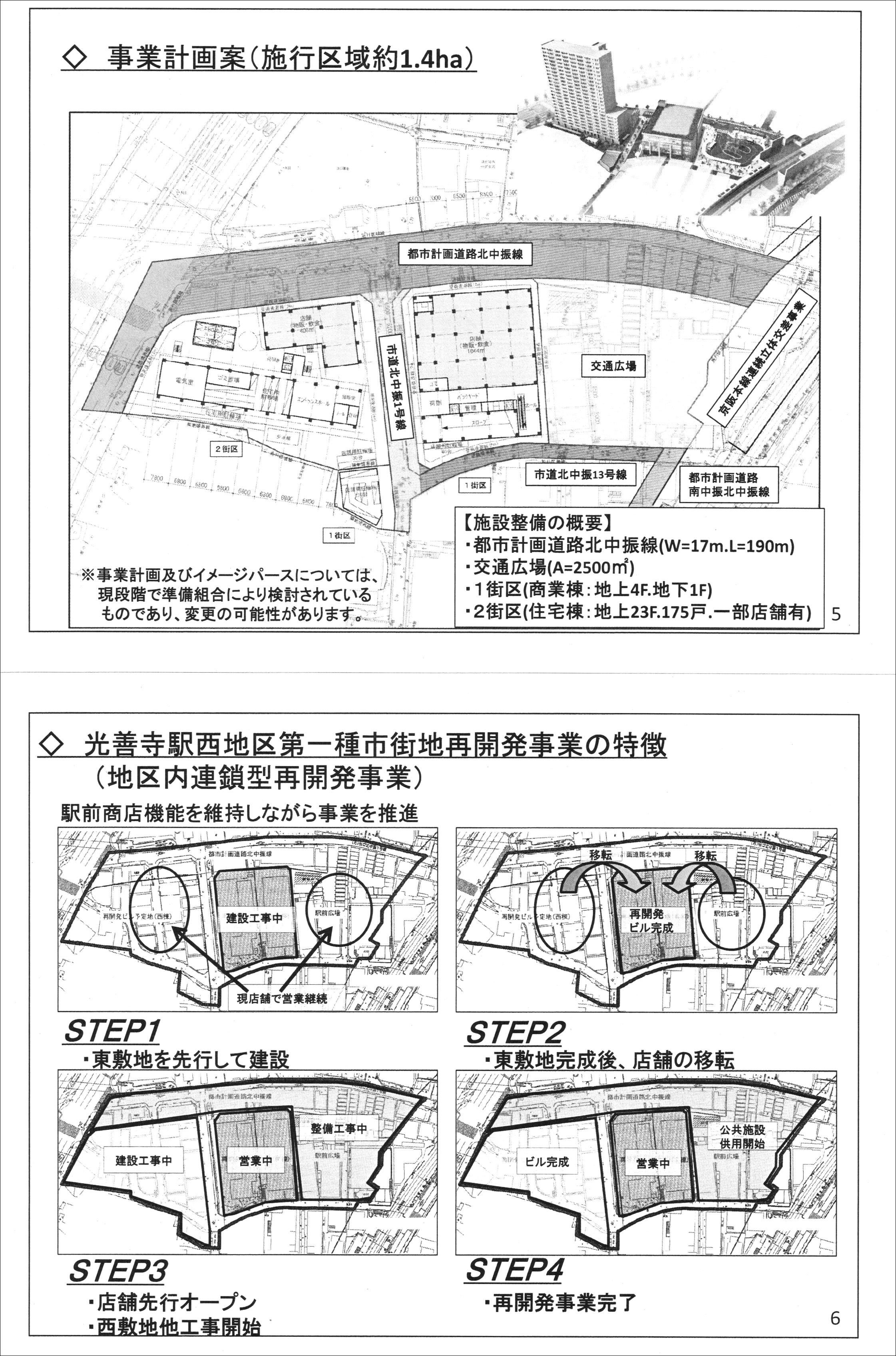 今回の件に関しては準備組合による、あくまで予定なので確実ではないということを何度も市の方がおっしゃっていたので、今後どうなるかは変わっていくものだと思いますが、現状では光善寺駅西地区はとにかく23階建てのマンション、そして地元のお店が入った商業施設、バスロータリーのある交通広場ができる予定のよう。