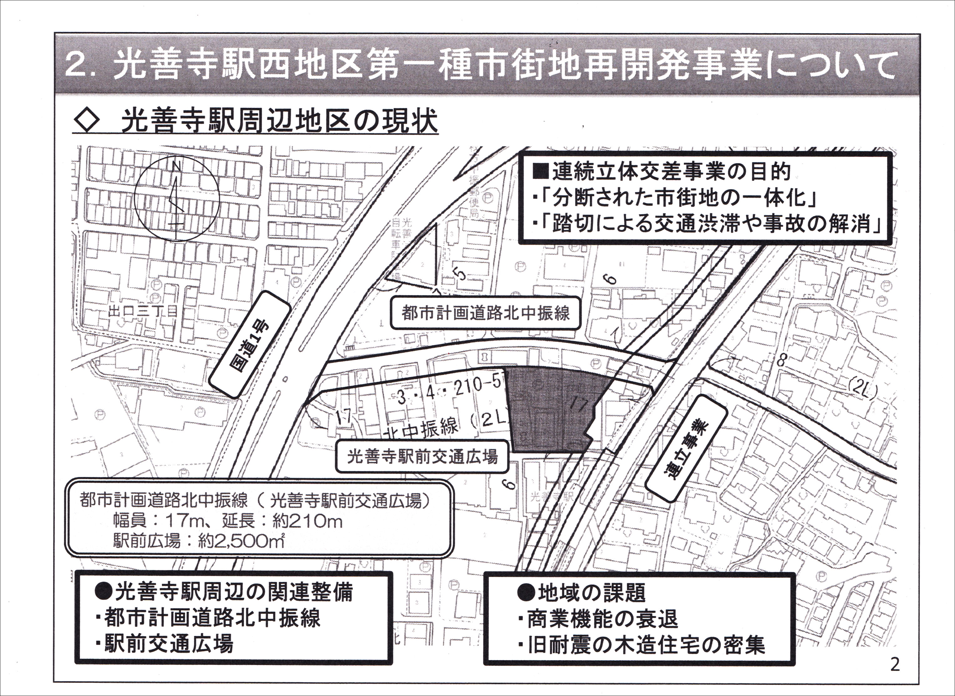 8月4日にさだ生涯学習市民センターにて行われた、光善寺駅西地区第一種市街地再開発事業等に関する説明会に出席してきましたので、そこでわかったことなどを掲載します。