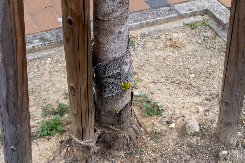 移植後の樹木は土壌への密着性が低いことから十分な水分吸収ができず、幹への水分供給が低下するため、樹皮の枯損や亀裂が起きたりするんだそう。そのため、この布が巻かれているんだとか。