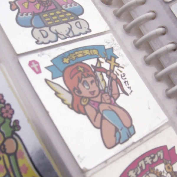 「ビックリマンを簡単に説明しますと、発売時期によって第1弾〜第31弾まであるんですが、例えば第1弾だと1枚だけキラキラシール、いわゆるヘッドと呼ばれるレアシールが入っていて、そのほかには同じマークでくくられた天使・お守り・悪魔の三すくみと言われるグループが12グループほどあります。第1弾は全部で37枚あって、キラキラシールはたったの1枚というレアっぷりでした。その後、弾が進むにつれてヘッドと呼ばれるシールの数が増えていくんですが、第17弾からは公正取引委員会からの勧告もあってヘッドのシール数が三すくみと同数にさせられて………ていうような……そういうものなんです。(詳しくはWikipediaをどうぞ)」