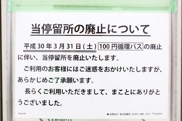 枚方市駅や中宮周辺を走る100円循環バスが3月31日をもって廃止されるそうです。