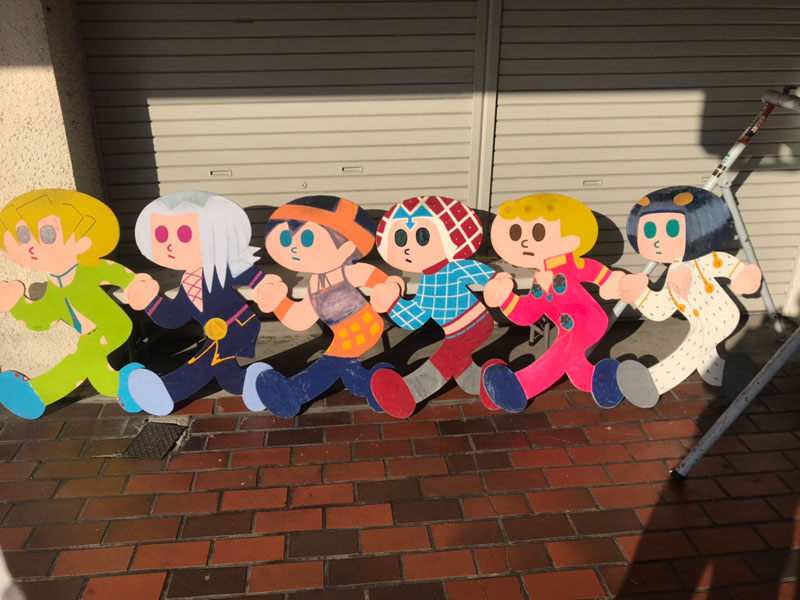 この飛び出し坊や風になっているキャラクター達は「ジョジョの奇妙な冒険 Part5 黄金の風」にでてくる主人公の御一行。(→Wikipedia)」