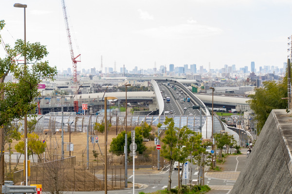 高速道路を見下ろしながら奥に見える都会のビル群が、なんかええ感じ。