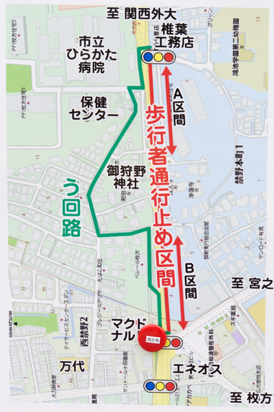 この交差点から市立ひらかた病院の方へ上がっていく坂道が通行止めになる予定です。