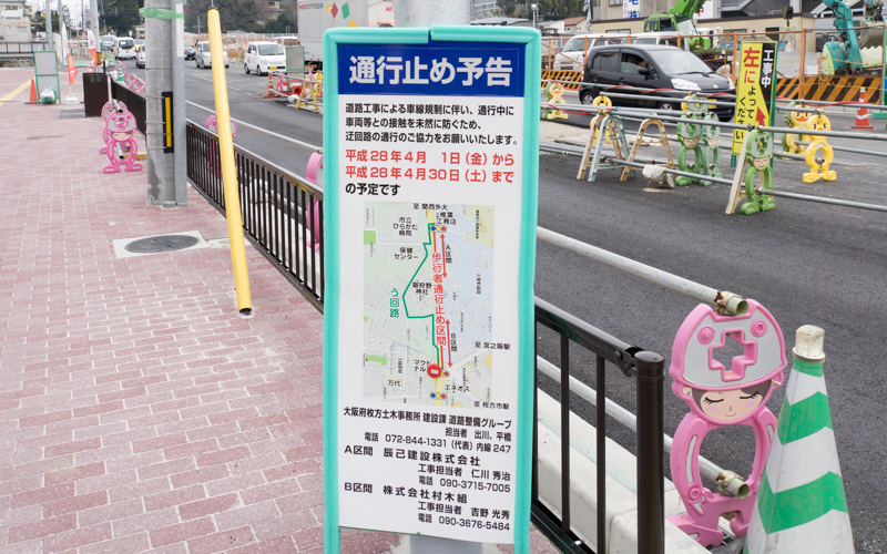 枚方市駅から市立病院の方に上がる道路の歩道が4月いっぱい通行止めになるようです。