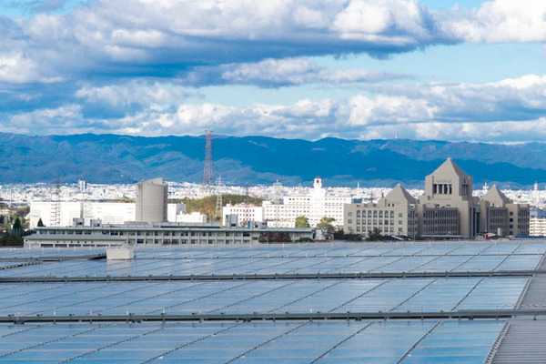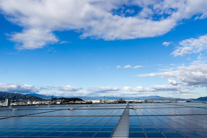 屋上にはたくさんのソーラーパネル。枚方市内でも一二を争う規模じゃないでしょうか。300世帯分くらい発電できるそうです。