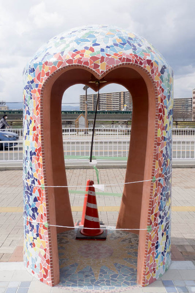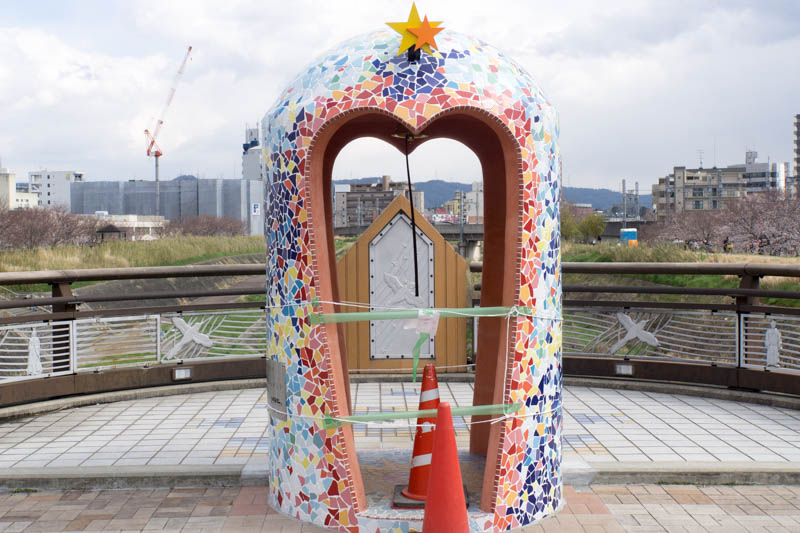 天津橋に設置された川崎麻世さんデザインの「しあわせのモニュメント」が工事中で使用禁止になっています。