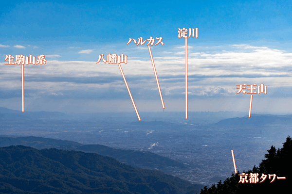 今回は比叡山やや見えてる位のコンディション時にいってきたんですが、もうちょっとくっきり見えてる時だと、もうちょっと枚方がくっきり見えてたかも。