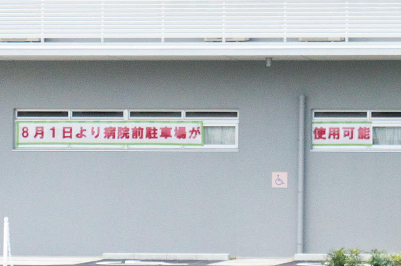 ちょっと見えにくいのですが、新棟側の建物には「8月1日より病院前駐車場が使用可能」との張り紙が。