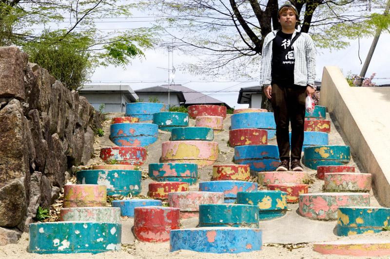「公園のカラフルな階段。そして僕。これを三脚を使って周りに怪しまれながらも1人で撮影したというバックグラウンドを想像してください。美しいでしょ?」