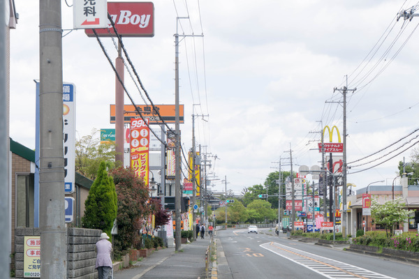 「あとは府道18号沿いにはご覧の通り、チェーン店がズラリ。色んなグルメ選択肢があります!そんな街です、東香里南町!」