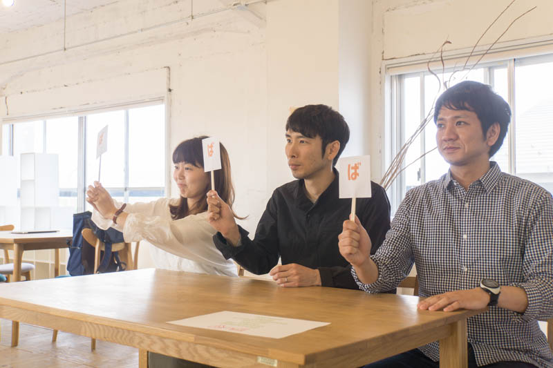 テーマごとのばばっち&すどんのプレゼンを聞いて、よかった方の札(すどんは“す”、ばばっちは“ば”)を上げてもらいます。