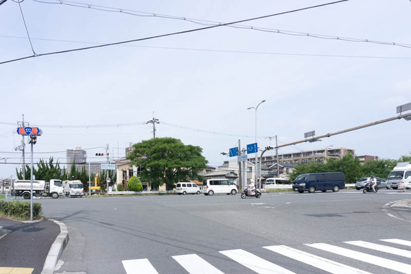 交差点「枚方大橋南詰」のそばにあります。上の写真だと真ん中の木の後ろ側。写真右側が枚方大橋方面で、左に行くと1号線と合流する地点の方へ。