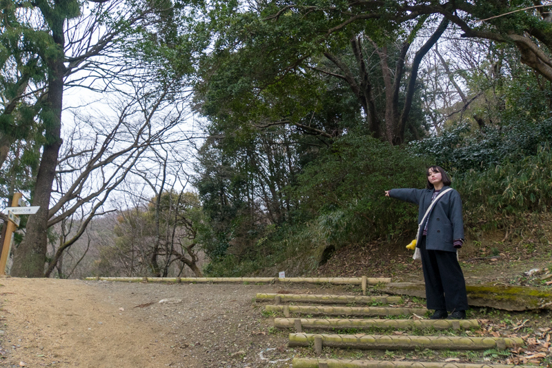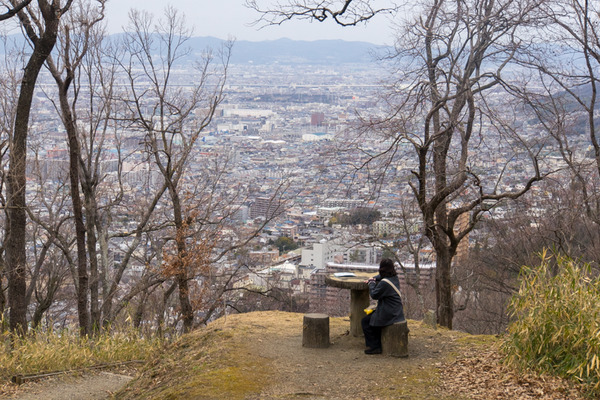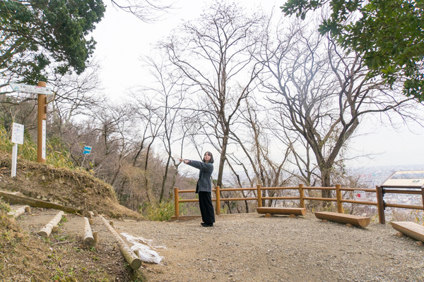 (14)ここは枚岡公園の「中展望」。ここからもほんの少しくらいは枚方も見えると思いますが、もう少し高みを目指して、