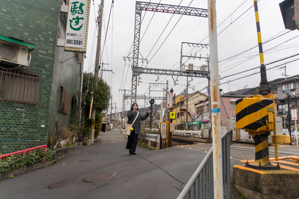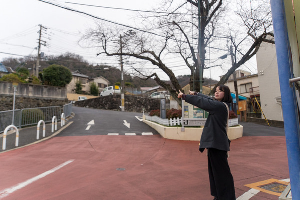 (5)踏切をこえると、駅前のプチロータリーがありますので、指差しているとおり山の方へ進みます。