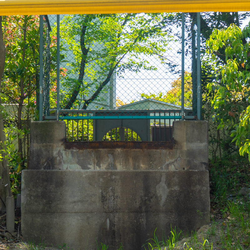 歩道橋の先にはかつてあった八幡4小の校門がありましたが、歩道橋がなくなったことによりもうよくわからない門に。