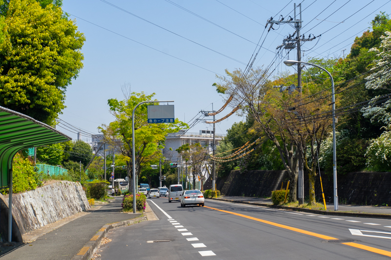 バス停「弓岡」の近くにありまして、こっちにいくと京都八幡高校の横を通って、動物園があるさくら公園などの方へ。