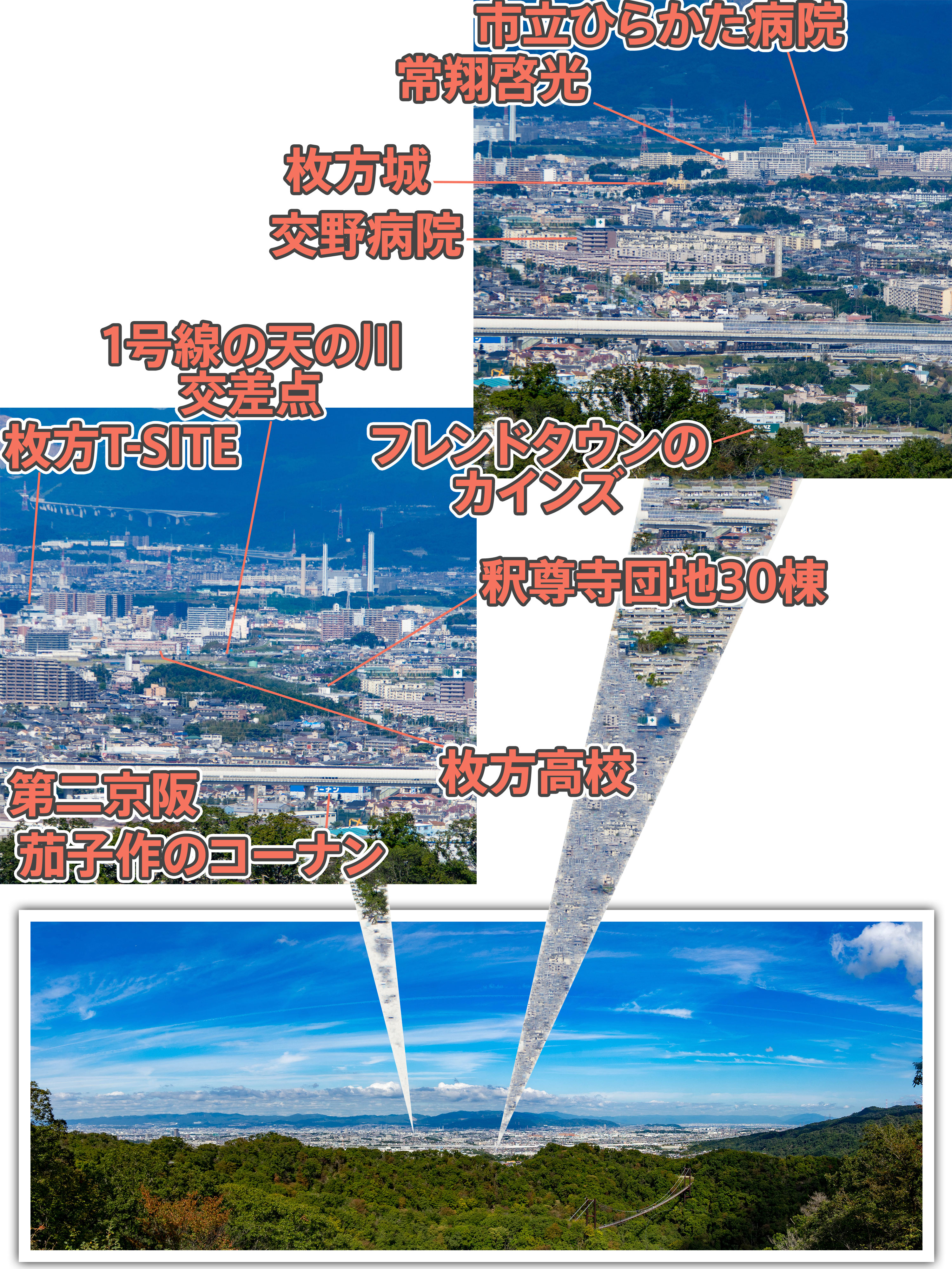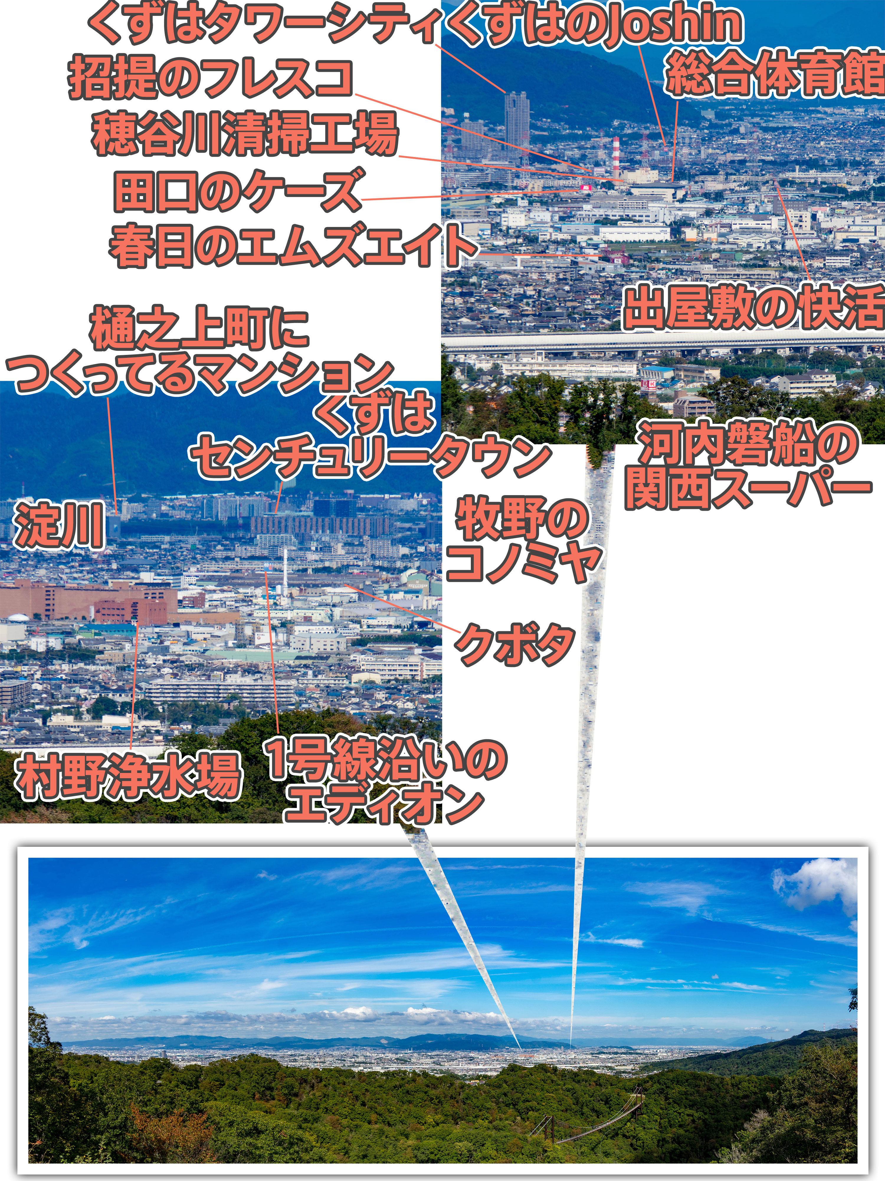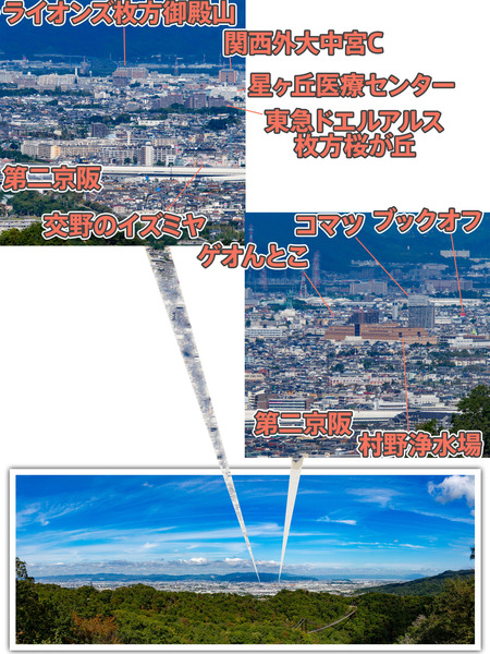 パノラマ写真でいうと左側、枚方の南西側から紹介していきます。写真は全てクリックで拡大可能↓