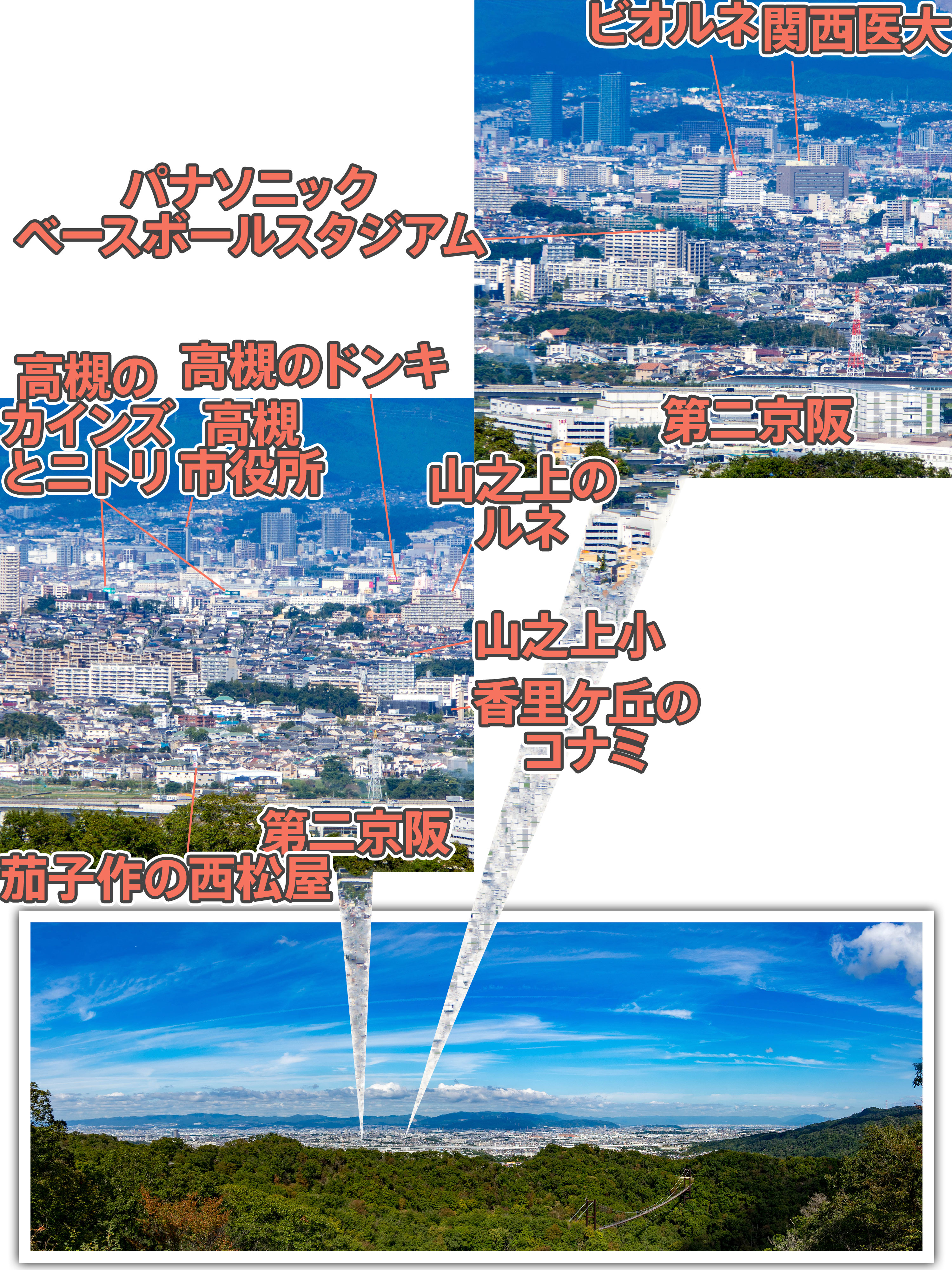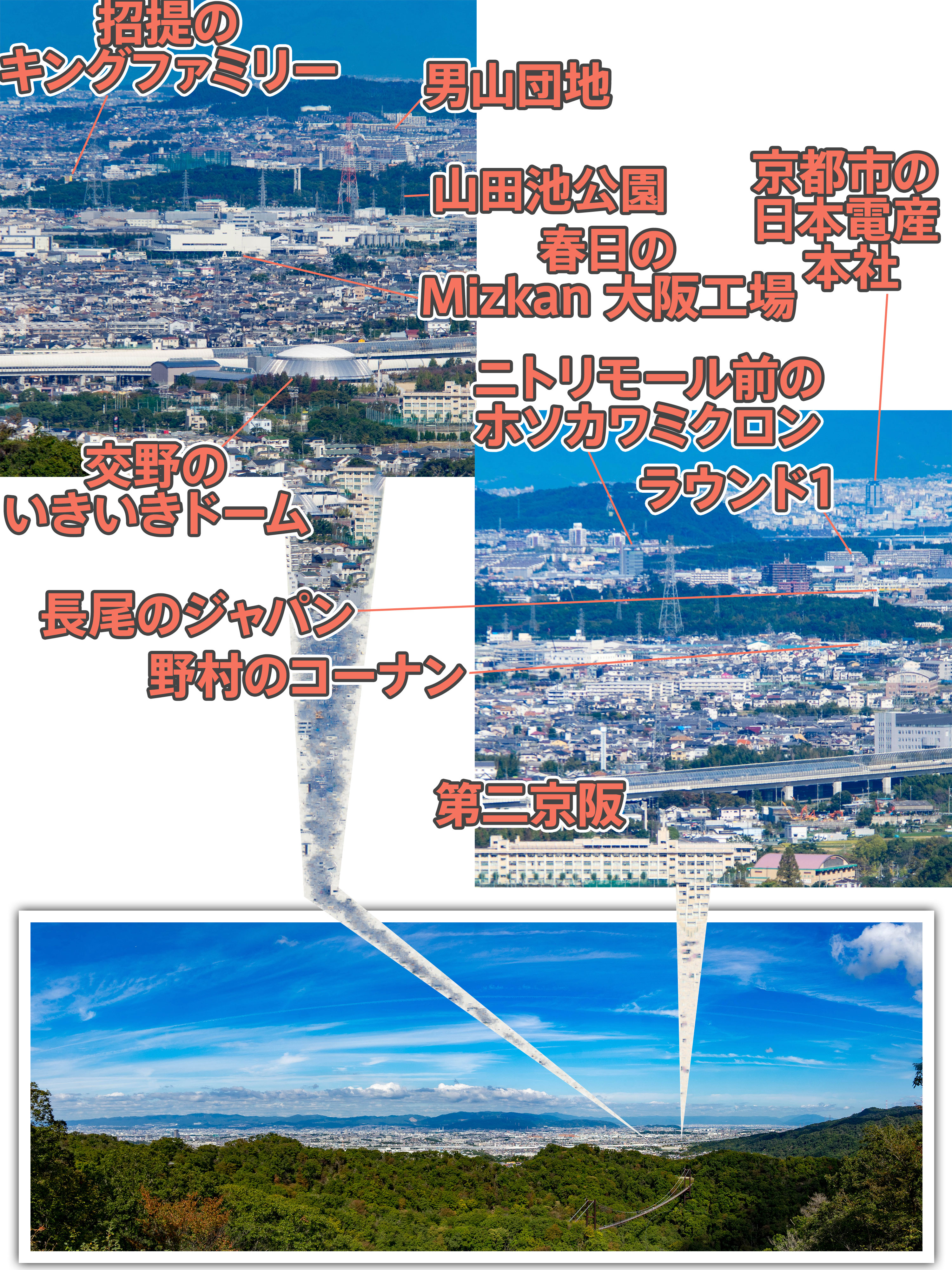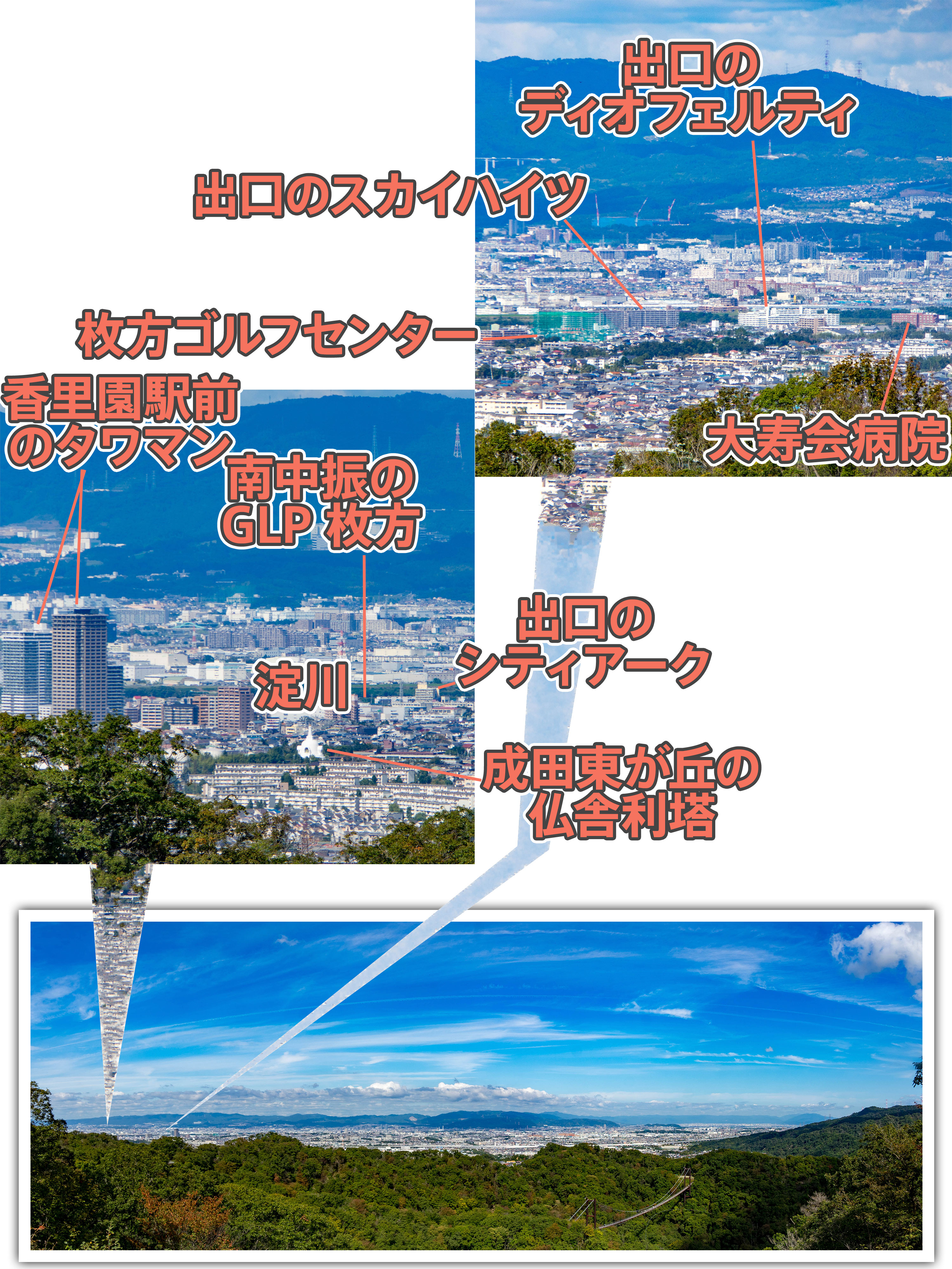 パノラマ写真でいうと左側、枚方の南西側から紹介していきます。写真は全てクリックで拡大可能↓