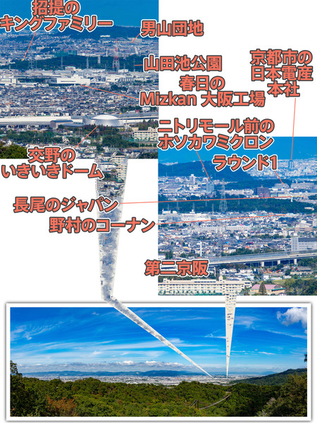 招提に山田池公園、ニトリモール前のホソカワミクロンなどなど。