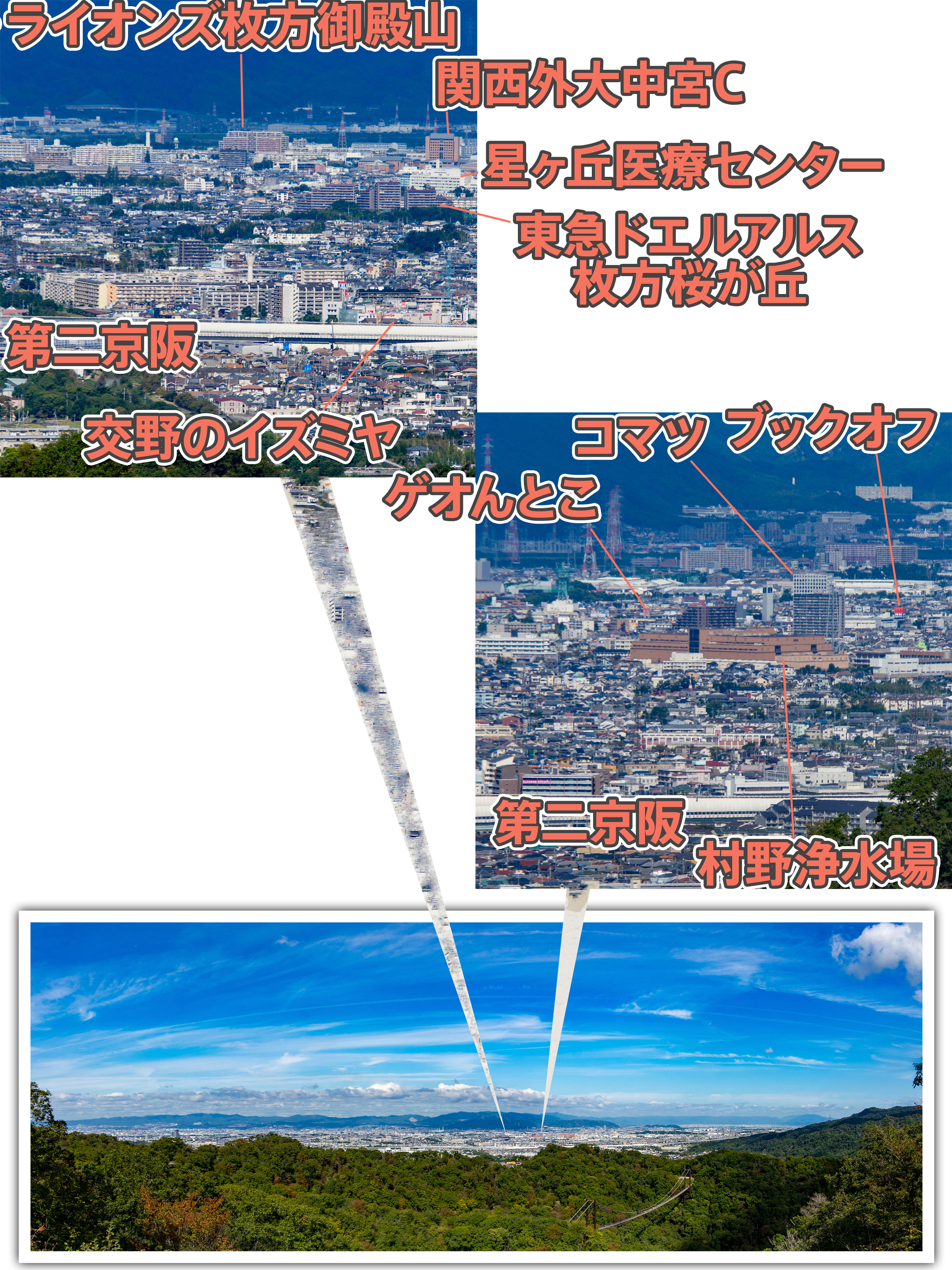 大まかにいうと、枚方市内が北から南まで一望できるという枚方のための景色スポット!(※ただし御殿山と牧野、くずはあたりはあまり見えない)