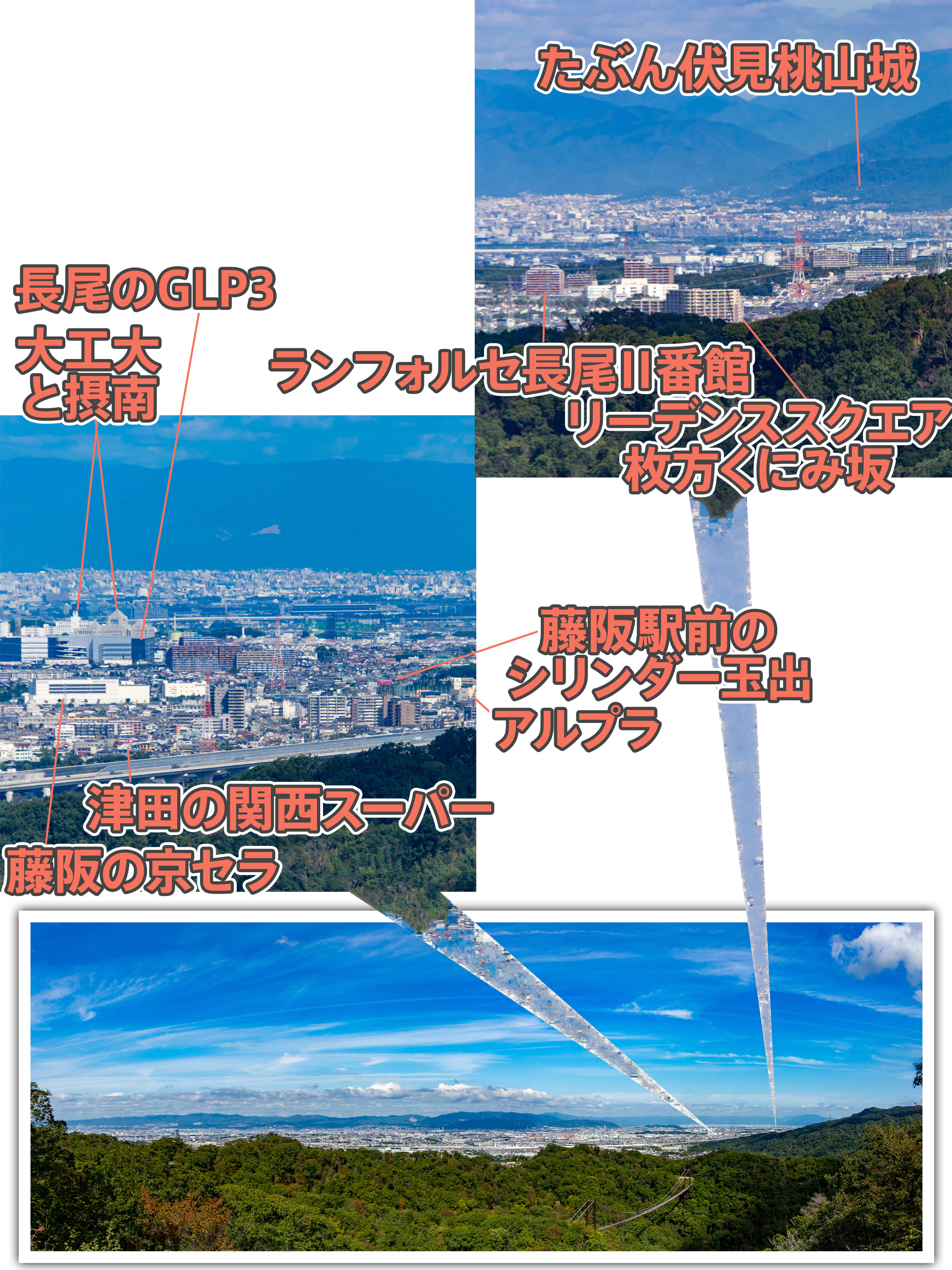 エリア的には香里園〜光善寺あたり。端っこの方で見えまして、香里園のタワマンたちは肉眼で簡単に判別可能です。