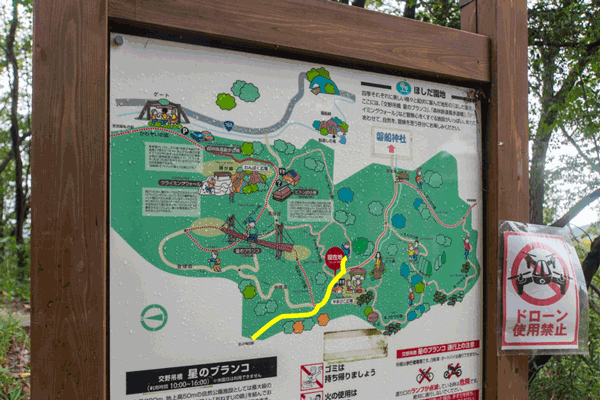(14)園内の地図。黄色い線にそってすすみます。ドローン使用禁止。