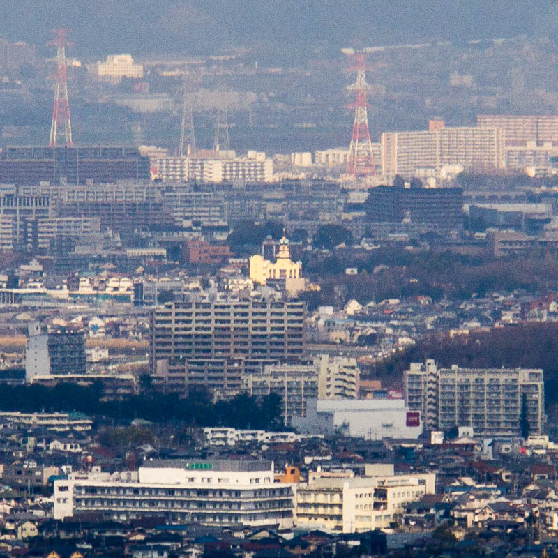まずはくずはタワーシティ。枚方北部ということもあり、距離があってわかりづらかったですが、やはりその圧倒的高さと形が特徴的で肉眼でも判断することができました。