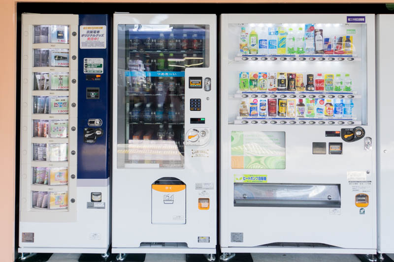 自販機の種類は左から京阪電車オリジナルグッズ、飲み物、飲み物、