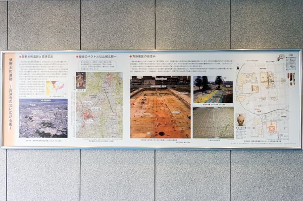 前述の通り抜けができるピロティ部分には、この建物が立っている場所でみつかった遺跡について記載されている看板が↓