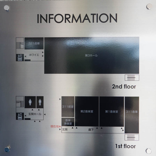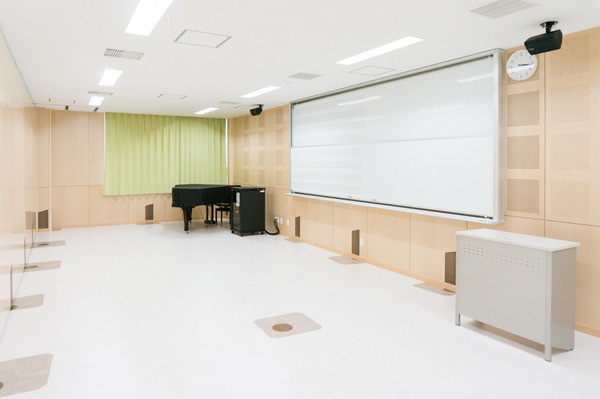 こちら第一音楽室。地面のマークはやはりデザインではなく、後述の遺構が見つかった場所を示しています。