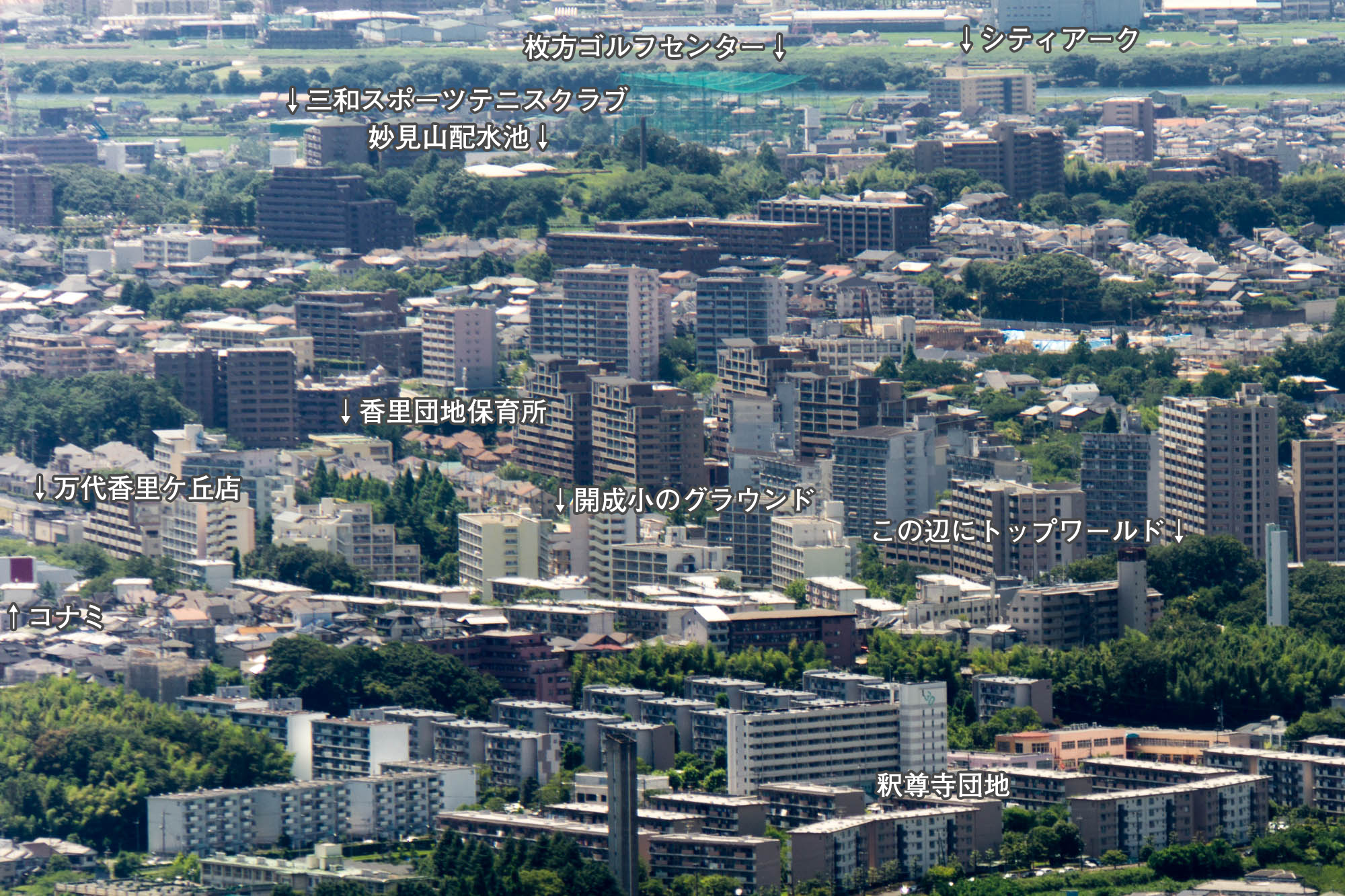 【追記】税務大学校から香里小が離れすぎではというご指摘を頂戴しましたが、香里小の矢印が少しうりこ山寄りになっていますが、オレンジのラインの建物がドイツ菓子店「ハイデ」が入っているビルだと思われまして、税務大学校も建物の形状的におそらく間違いないと思われます。よって、ズームレンズの圧縮関係か、カメラのレンズの歪みとかの問題なのかな?という感じだと捉えております。それちゃうやろってのがあればご指摘おまちしております!