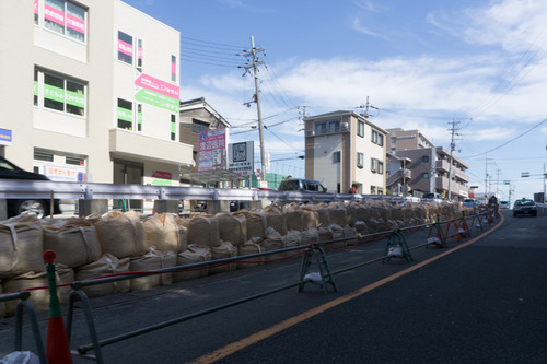 以前まで使用されていた道路部分は土のう?か何かが積み上げられています。