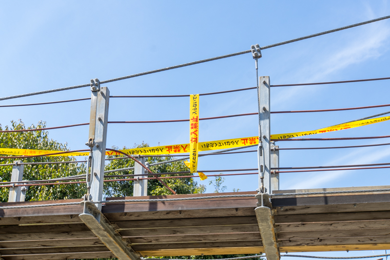 吊り橋の入り口部分に工事用フェンスが設置され、利用できなくなっているのがわかります。