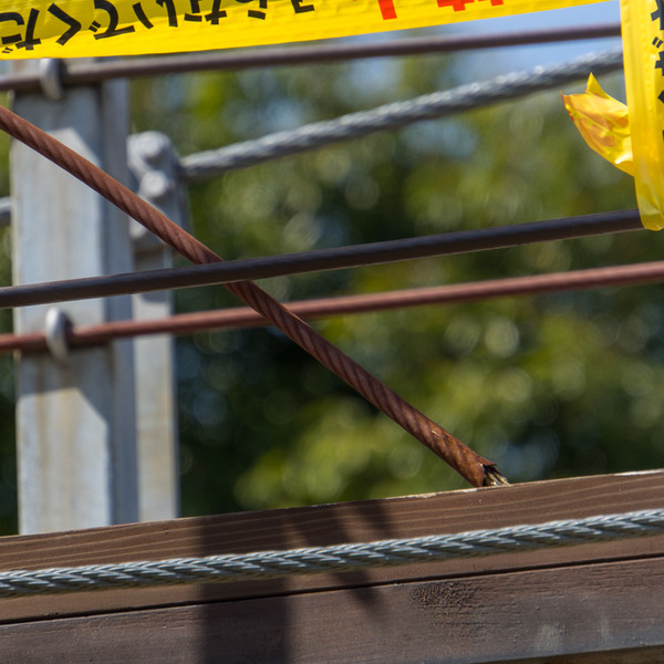 横からみると、なにやら吊り橋の途中に立ち入り禁止のテープがはられているのがわかります。