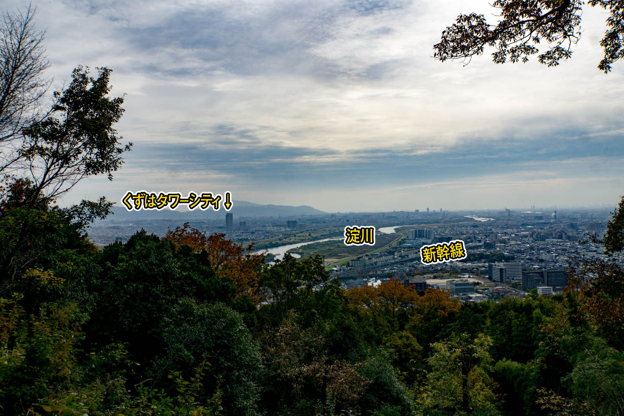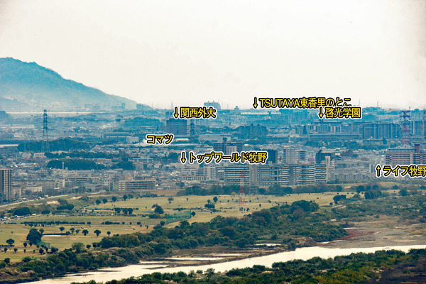 全景。あまり詳しくはわからないので、北側(くずは方面)からズームしてみていきます。(ここから先の写真は見やすいように加工しています)