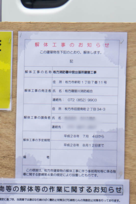 解体工事のお知らせの張り紙。