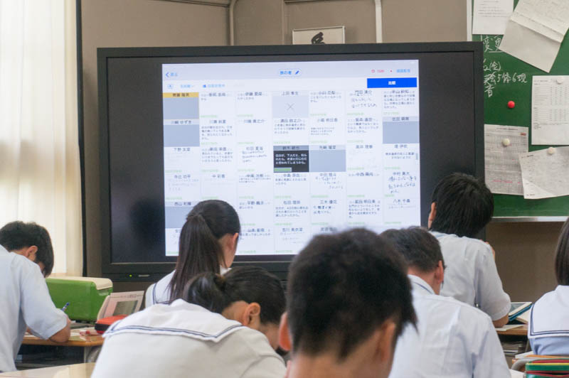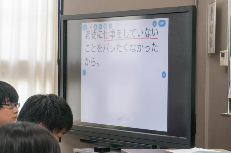 生徒が書いた回答が前面のモニターに出るという仕組み。しかもそれに先生が赤線をひいて解説していました。