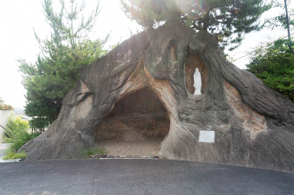 そのそばにはマリア像があり、マリア像を守るように木が伸びているのが特徴的。