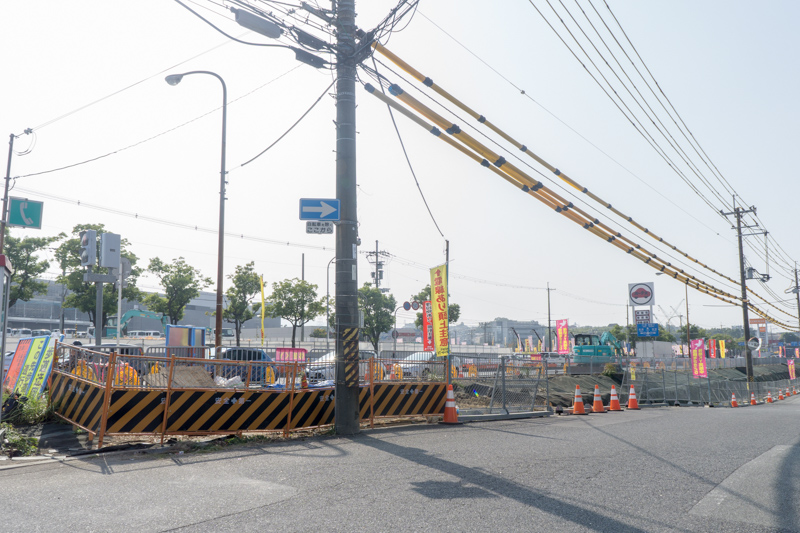 国道1号線ぞい北山に建設中のニトリモールの前で、道路工事が行われています。