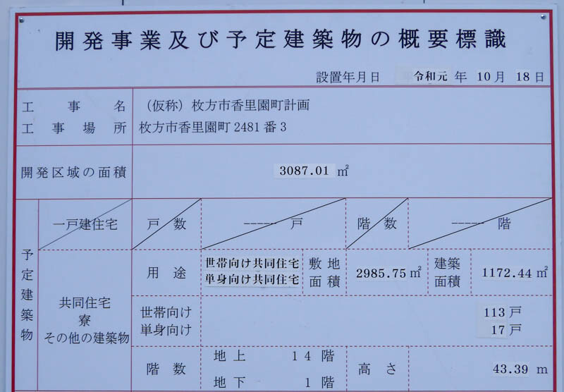 すぐ近くにはザ・香里園タワーやザ・香里園レジデンスなど高いマンションがありますし、この付近はさらに高い建物が密集してる場所になりそうですね。
