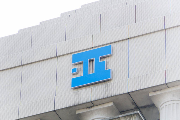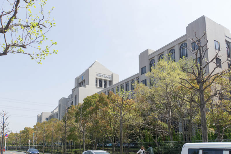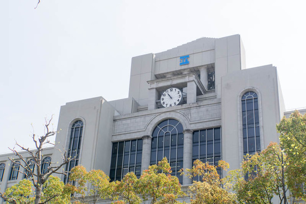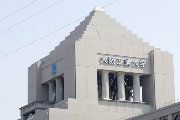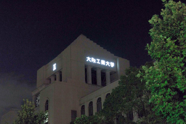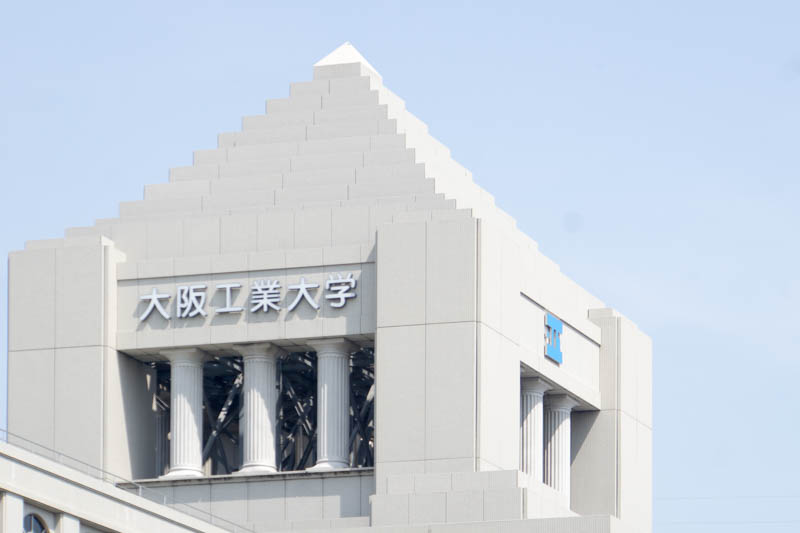 北山にある国会議事堂ライクな大阪工業大学に青いマークが設置されています。