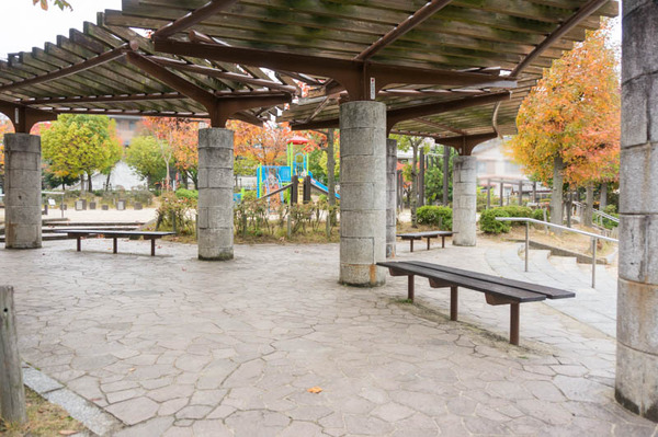 遊具の他に屋根のある休憩スペースと広いトイレも完備。