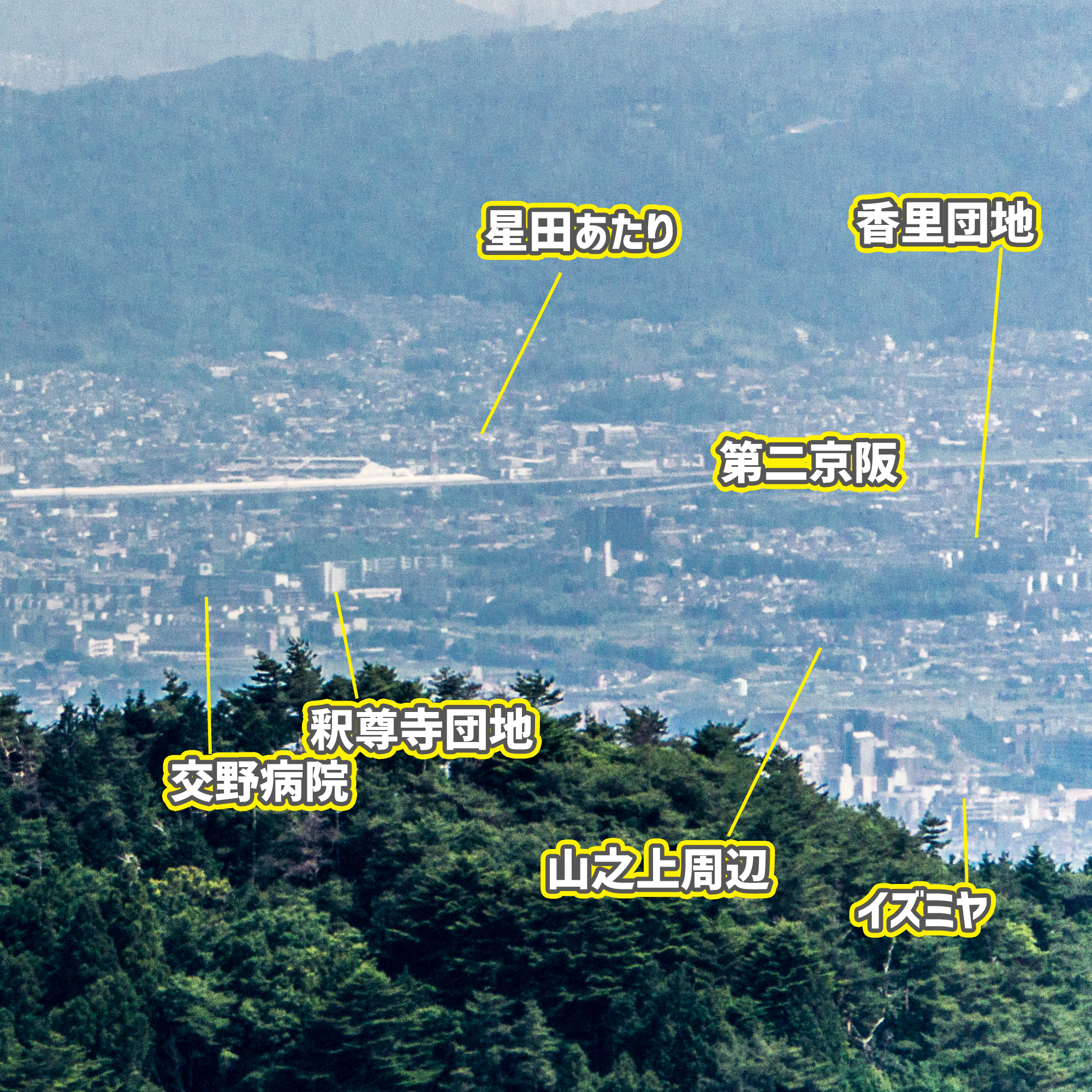そこから少し右側を見ると、釈尊寺町や香里ケ丘が。そして右下は宮之阪が見えます。