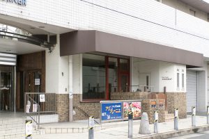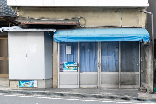青いテントが特徴的な田崎商店の正面。
