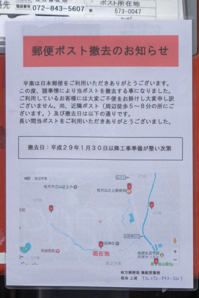 郵便ポスト撤去のお知らせとのことで、1月30日以降に撤去するという告知が。
