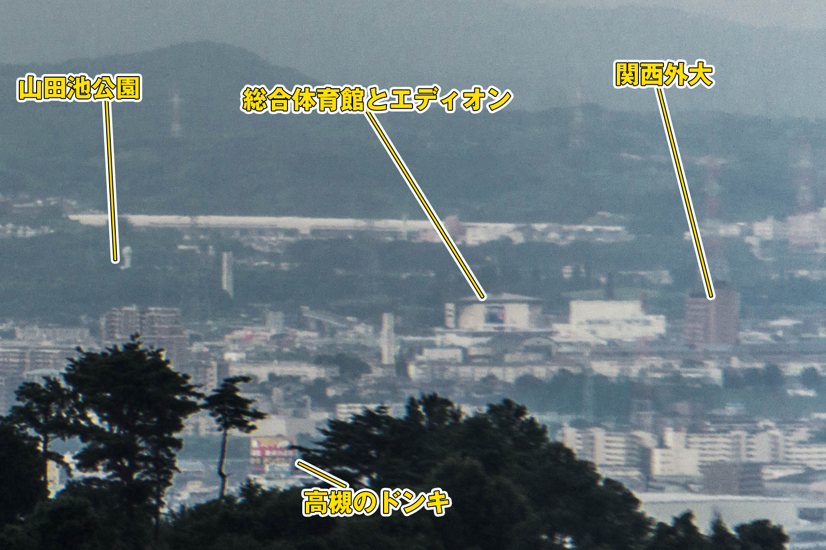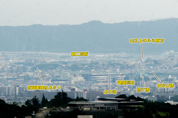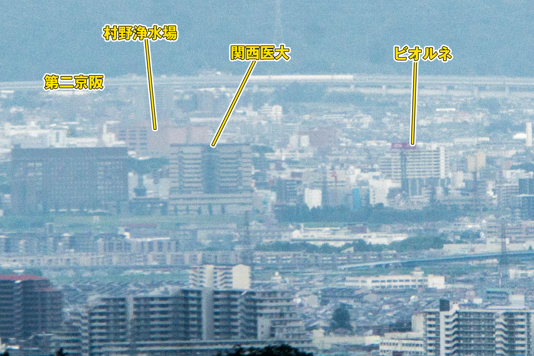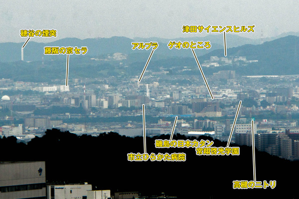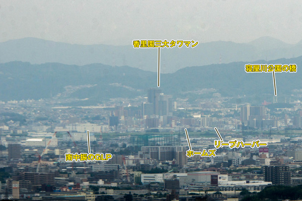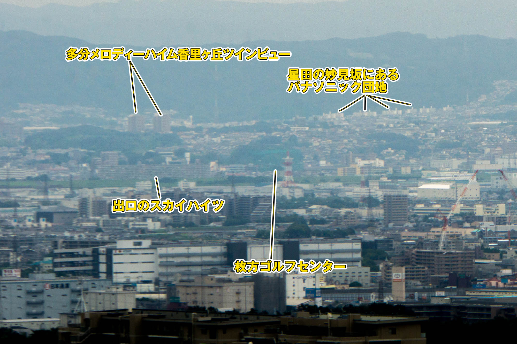 合成しているので手前の手すりがちょっとばぐっています。赤で丸している部分が枚方あたり。ズームしてみるとこんな感じでいろいろ見えます↓